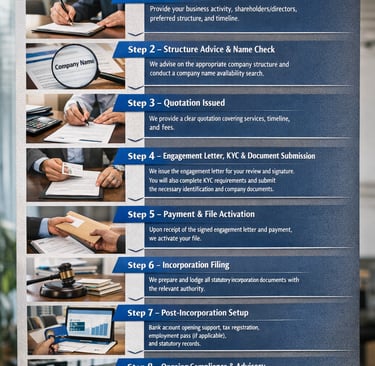 We offer a full suite of corporate services including company formation, secretarial support, corporate advisory, structuring, accounting, tax, and legal solutions all designed to help businesses stay compliant and grow strategically.